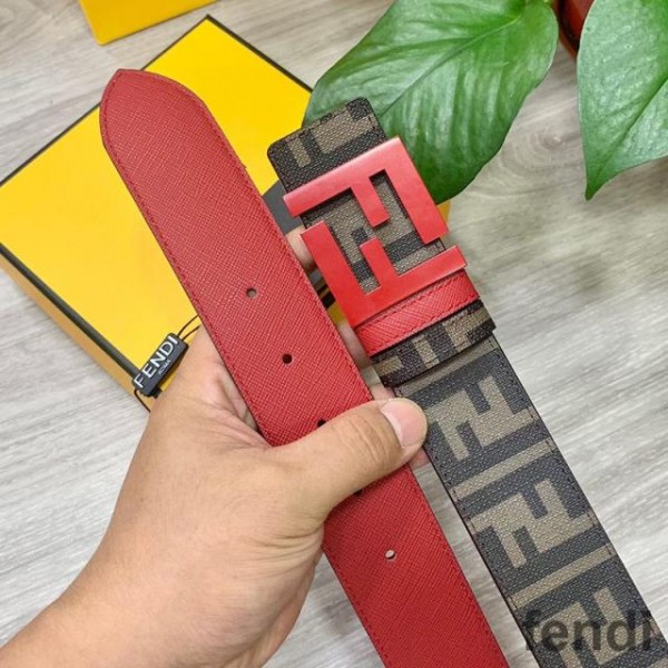 Fendi Enamel FF Buckle Reversible Belt In FF Motif Fabric and Calfskin Brown/Red