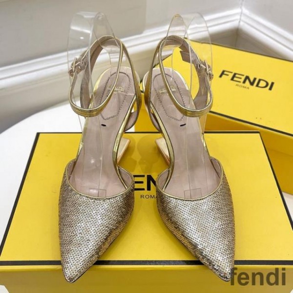 Fendi First Slingback Pumps Women Calf Leather with Sequins Embroidery Gold