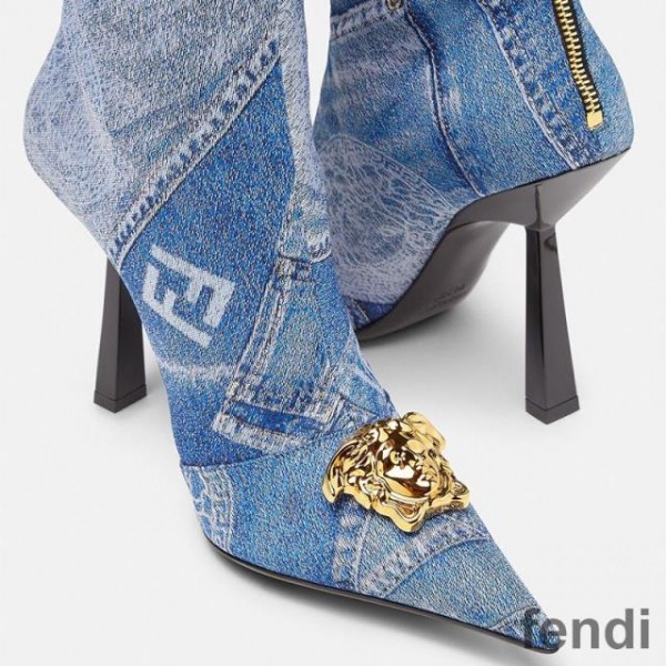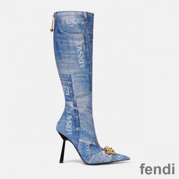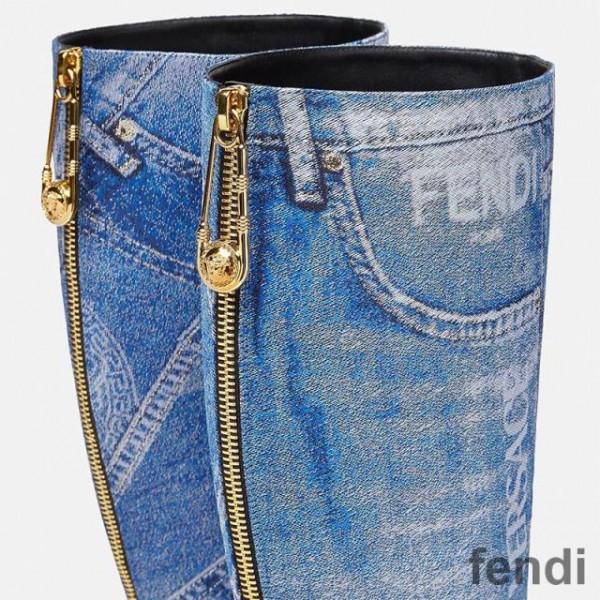 Fendi Knee High Ankle Boots Women Fendace Patchwork Denim Blue