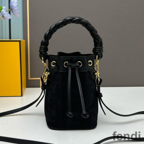 Fendi Mini Mon Tresor Bucket Bag with Woven Handle In FF Motif Canvas Black