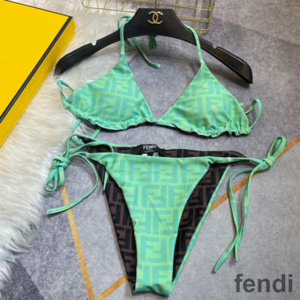 Fendi Reversible Triangular Bikini with Ties Women FF Motif Lycra Brown/Green