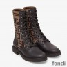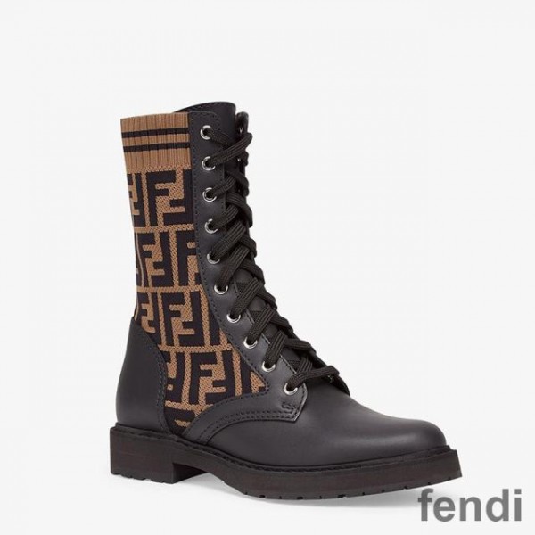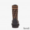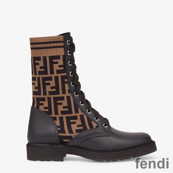 Fendi Rockoko Combat Boots Women Leather with FF Motif Stretch Fabric Brown