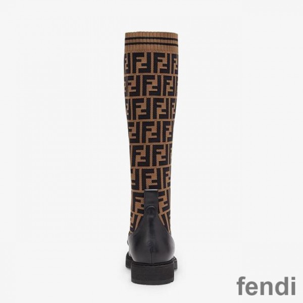 Fendi Rockoko High Ankle Boots Women Leather with FF Motif Stretch Fabric Brown