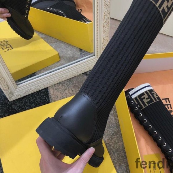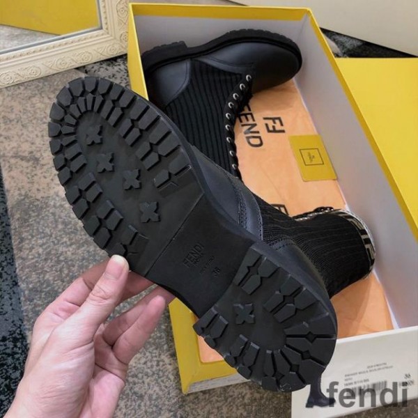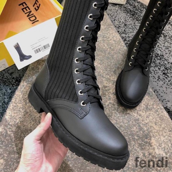 Fendi Rockoko High Combat Boots Women Leather with FF Stripes Stretch Fabric Black/White