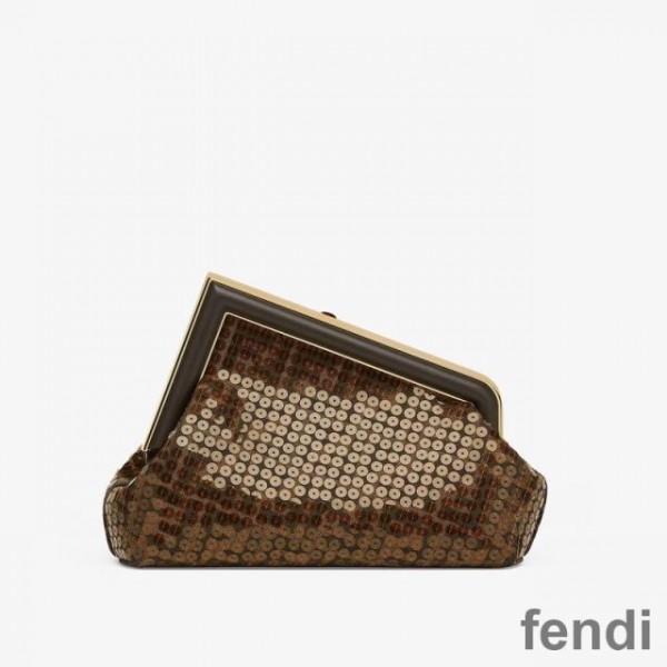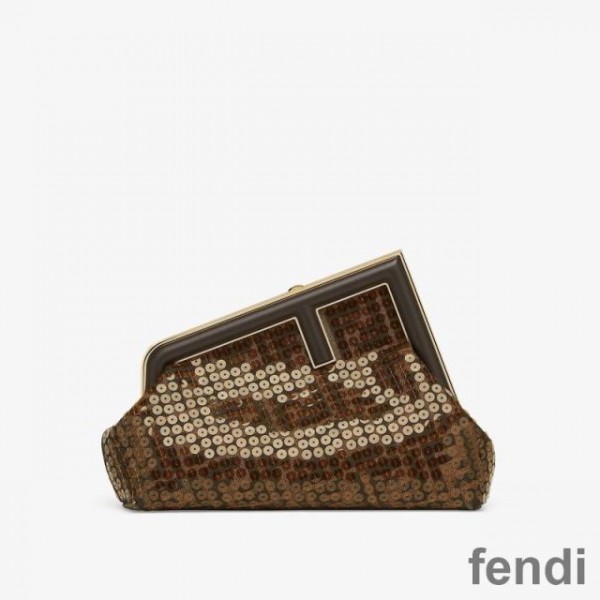 Fendi Small First Bag In FF Motif Fabric with Sequins Brown